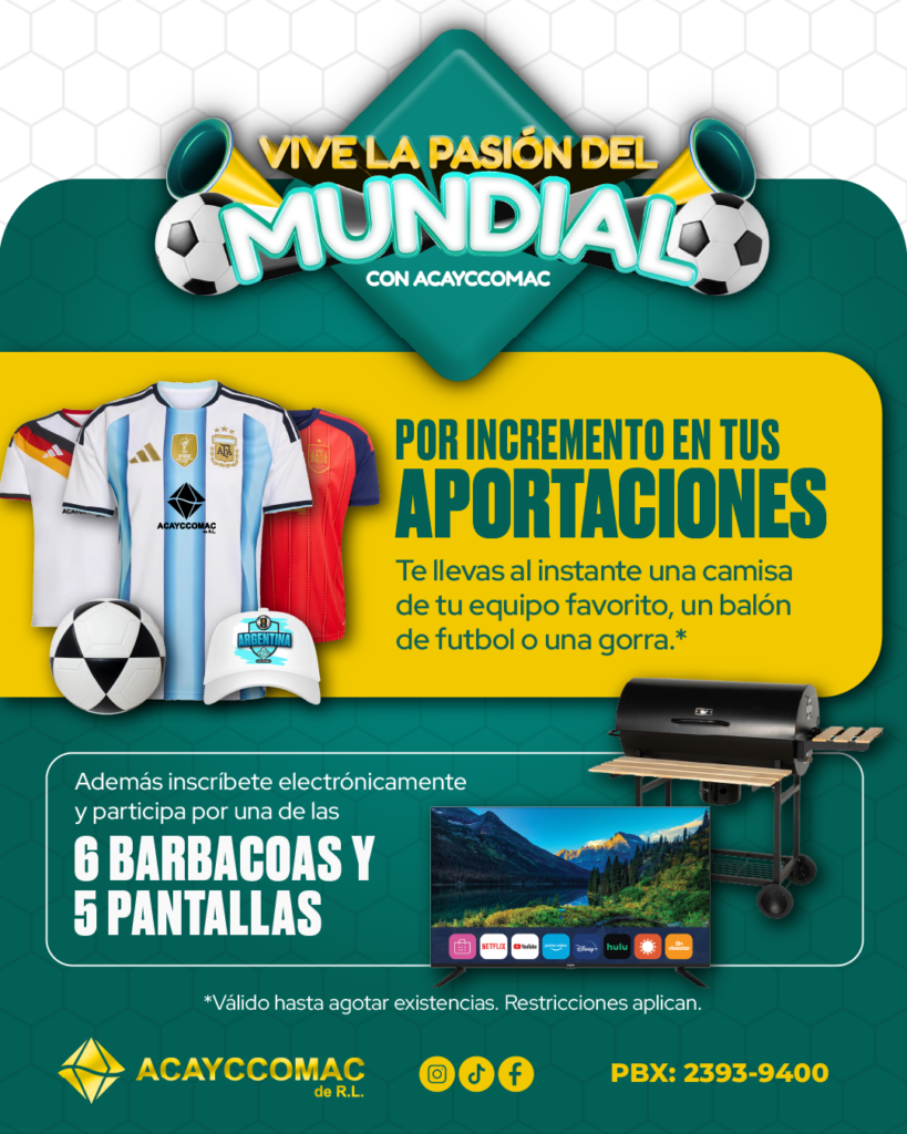 Esta promoción brinda a los asociados la oportunidad de obtener premios al instante al realizar sus aportaciones, incluyendo camisetas, balones y gorras. Asimismo, quienes participen bajo las condiciones establecidas podrán optar a premios mayores, consistentes en seis barbacoas y cinco pantallas, pensados para disfrutar la experiencia del Mundial 2026.
